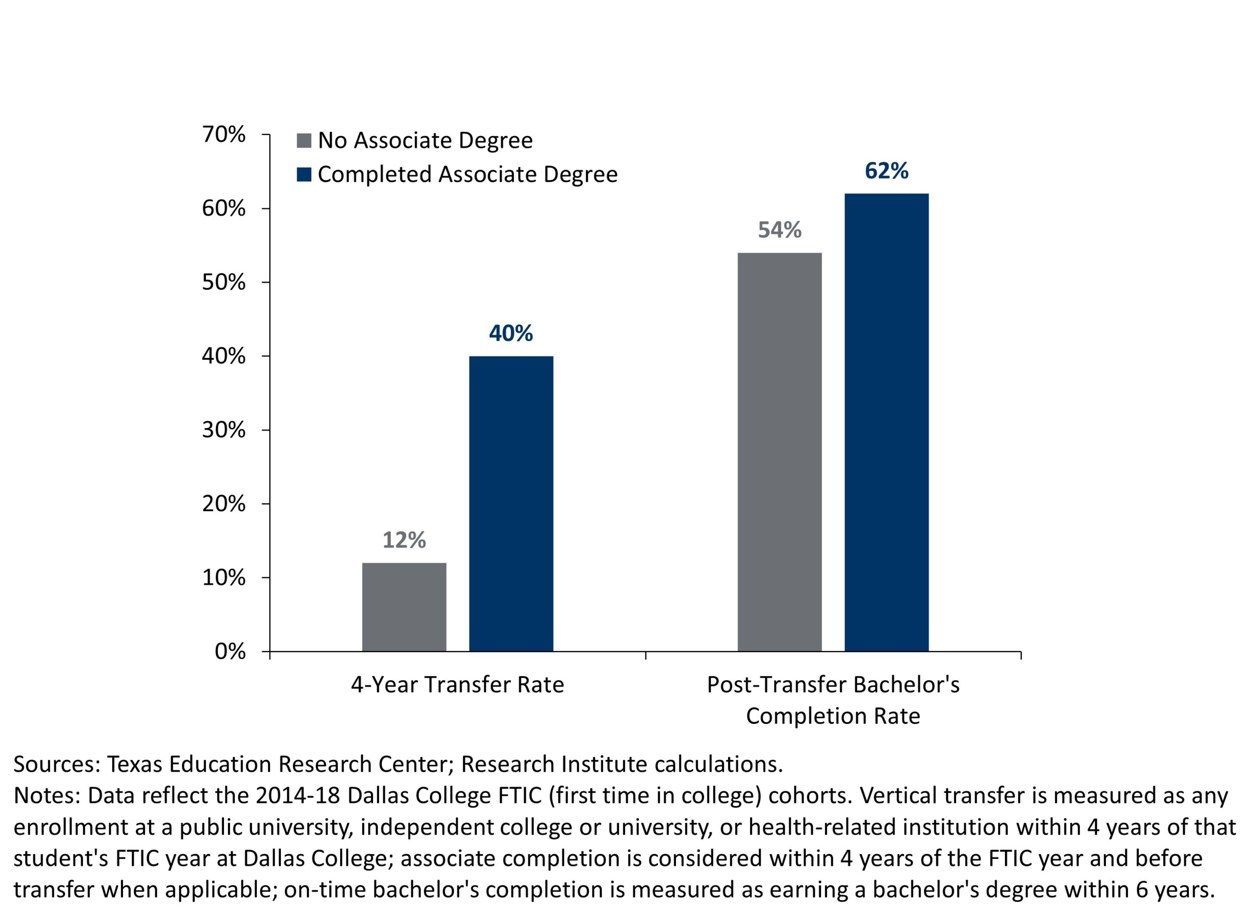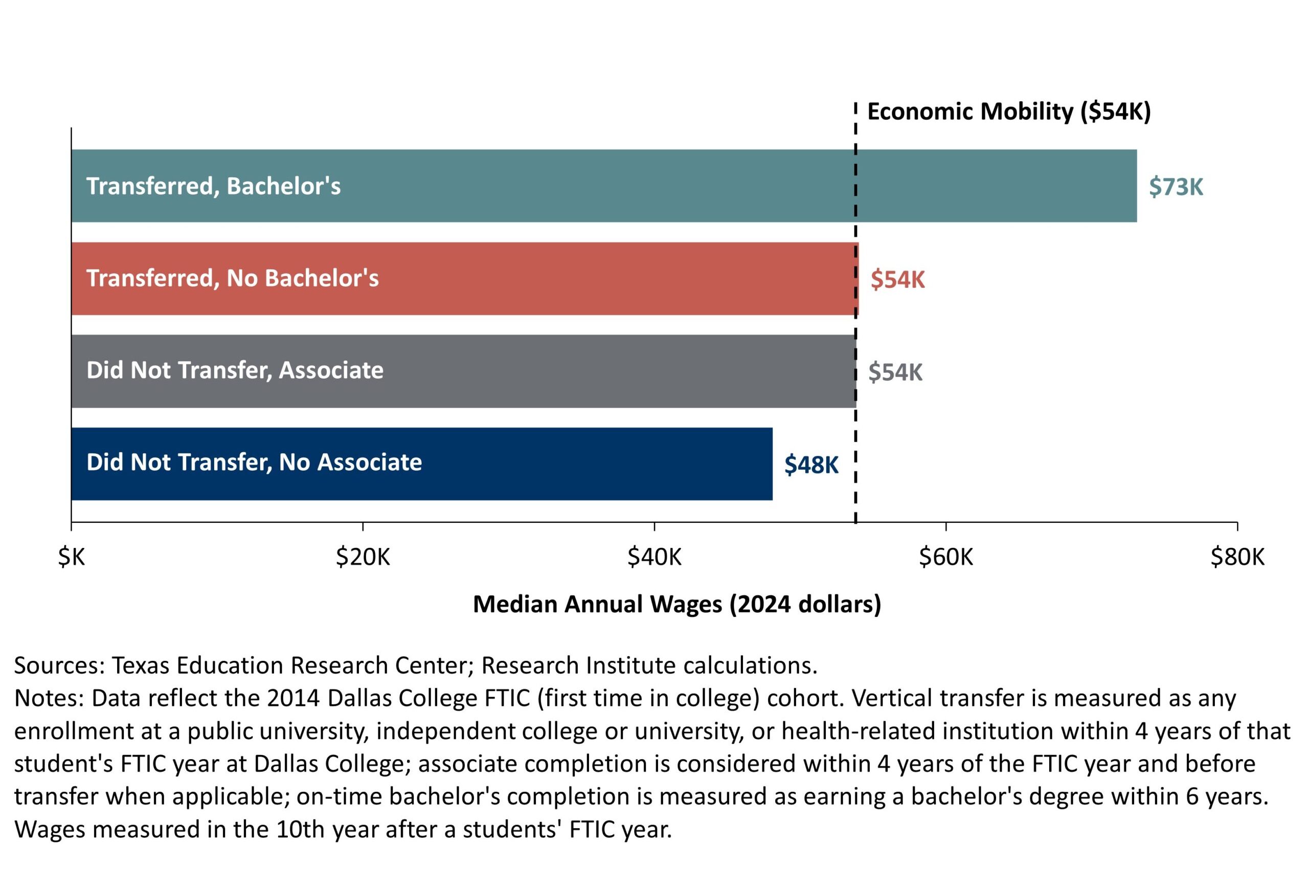 In our report, Transfer Pathways and Economic Mobility: Evidence from Dallas College and North Texas, we further examine how outcomes vary across student demographics, program of study, and transfer destination. This spring, we will release a follow‑up report investigating how academic ability shapes student transfer. Stay tuned for additional reports from the Research Institute at Dallas College as we continue to study what makes transfer work for more students.