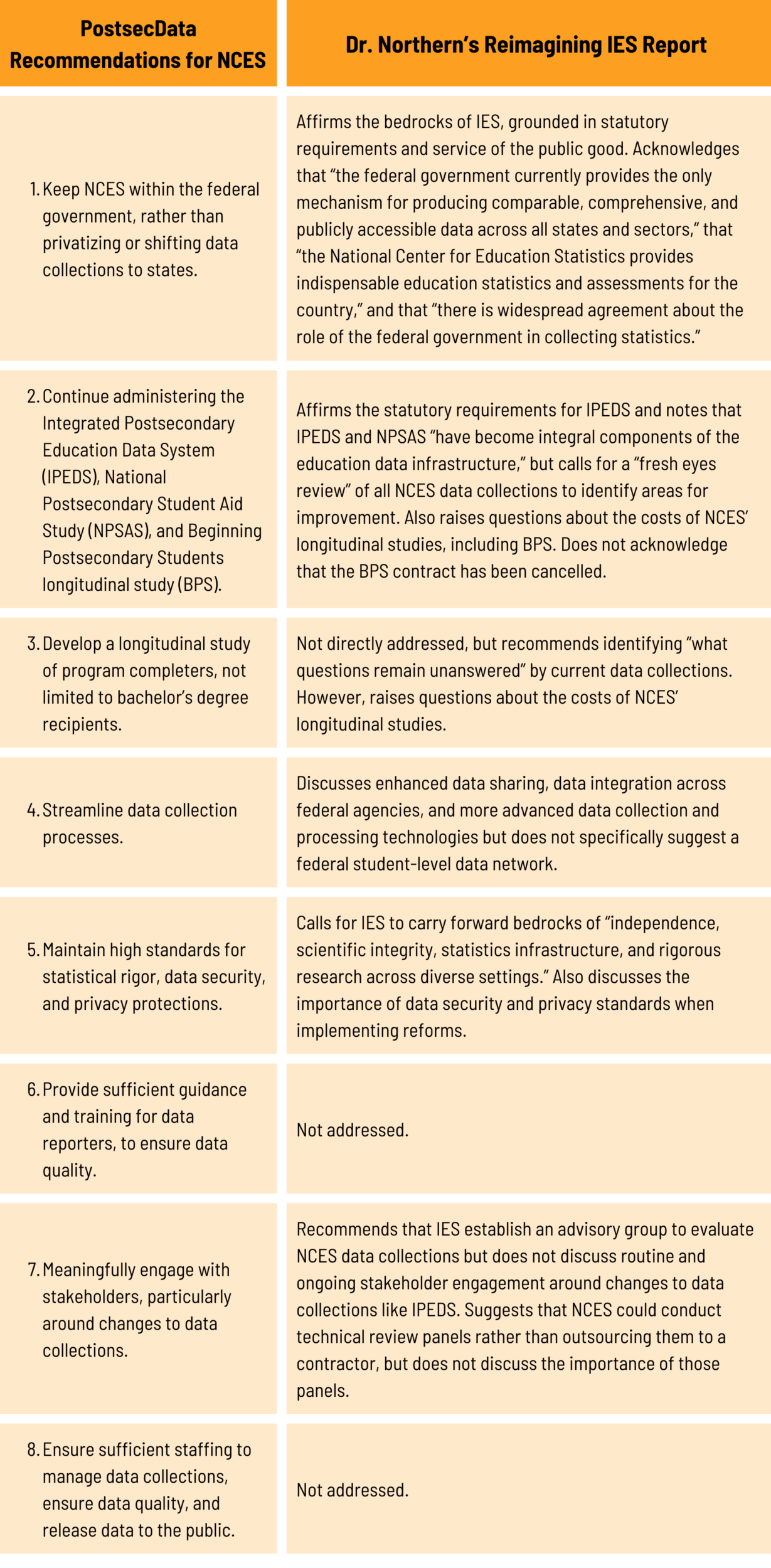 Dr. Northern’s report was informed by responses to the Education Department’s request for information about redesigning IES issued last fall. We led a coalition of 51 members and partners of PostsecData in sharing nine key recommendations for the postsecondary data collections administered by the National Center for Education Statistics (NCES), an independent statistical agency within IES.