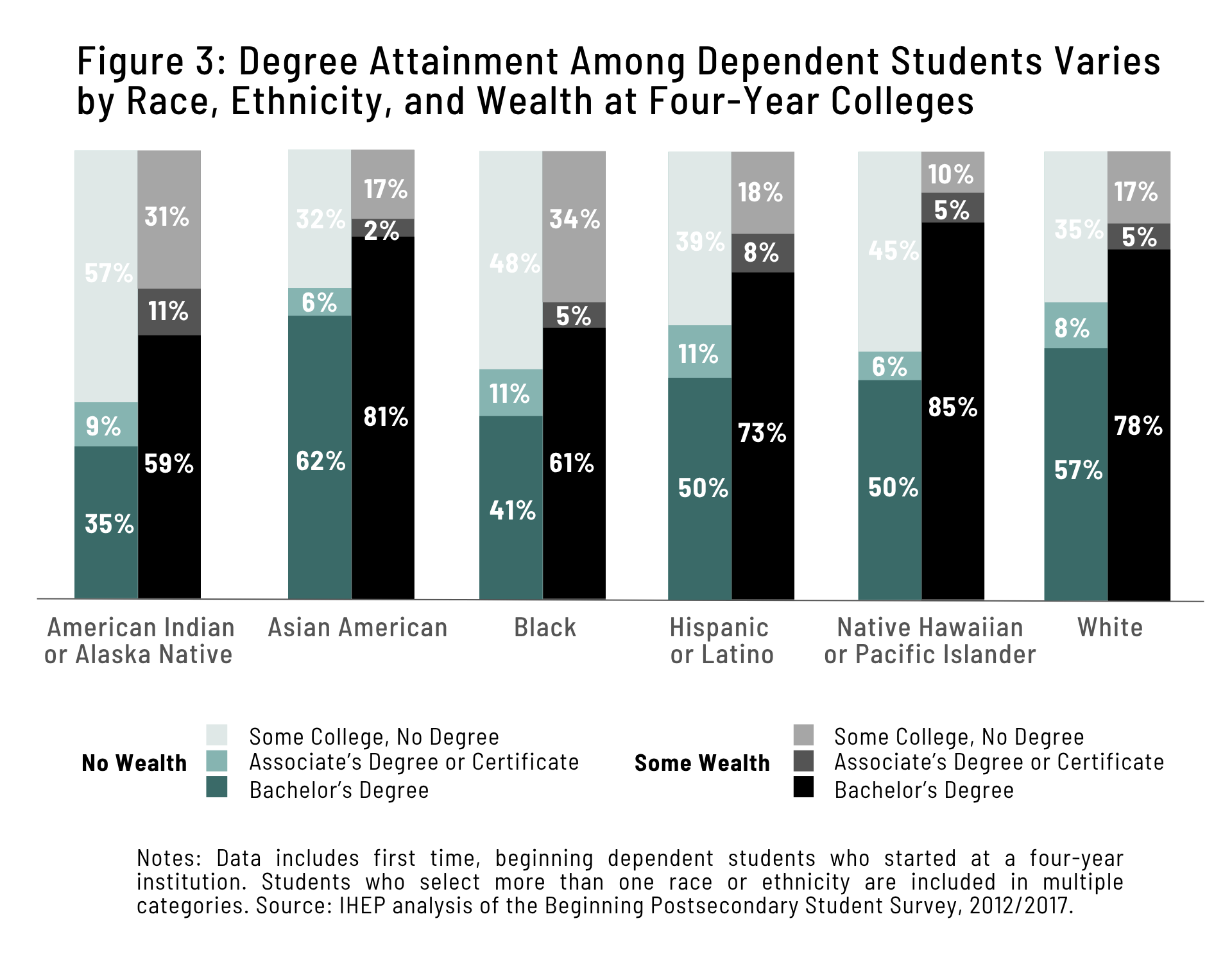 Despite strong aspirations, levels of wealth shape students’ higher education journeys from enrollment to completion. Wealth disparities combined with barriers to postsecondary success contribute to higher stop out rates and lower attainment for under-resourced students.